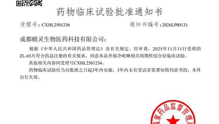 近日,赜灵生物收到国家药品监督管理局核准签发的《药物临床试验批准通知书》,批准ZL-65片在冷吡啉相关周期性综合征(CAPS)中开展临床试验。