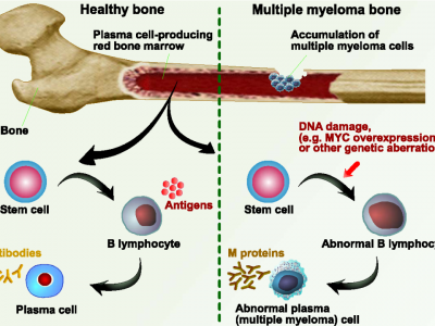 多发性骨髓瘤是一类起源于骨髓中的癌变浆细胞的B细胞类肿瘤。癌变浆细胞失控地分泌突变、未成熟的免疫球蛋白(M蛋白)。MM的发病原因是骨髓微环境中的基因异常(例如癌基因MYC、IRF4突变)导致浆细胞恶性增殖,但是,该过程中许多具体机制尚不明确