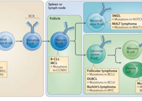 B细胞相关肿瘤包括B细胞淋巴瘤、B淋巴细胞相关白血病和多发性骨髓瘤,都属于血液系统肿瘤。所有血液细胞的祖先都是造血干细胞。造血干细胞可以分化为髓样干细胞和淋巴样干细胞,淋巴样干细胞在不同的器官中进一步分化为NK细胞、B细胞和T细胞,统称为淋巴细胞。其中,B细胞的分化主要在骨髓(bone marrow)完成,因而得名。